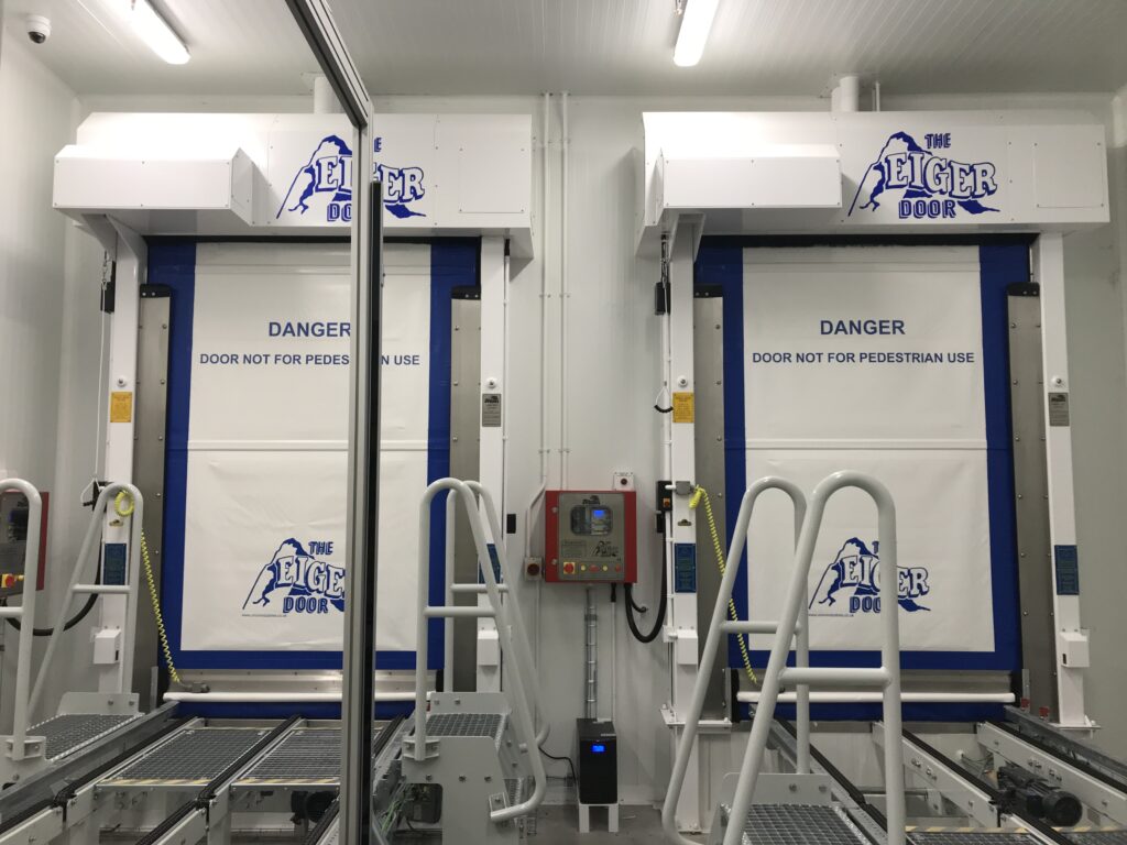 Eiger Door is the first automatic High Speed freezer door invented to operate reliably & effectively at high speed, thus eliminating snow & ice on the door blade and around the freezer opening, and at the same time helping to reduce cold store energy costs.